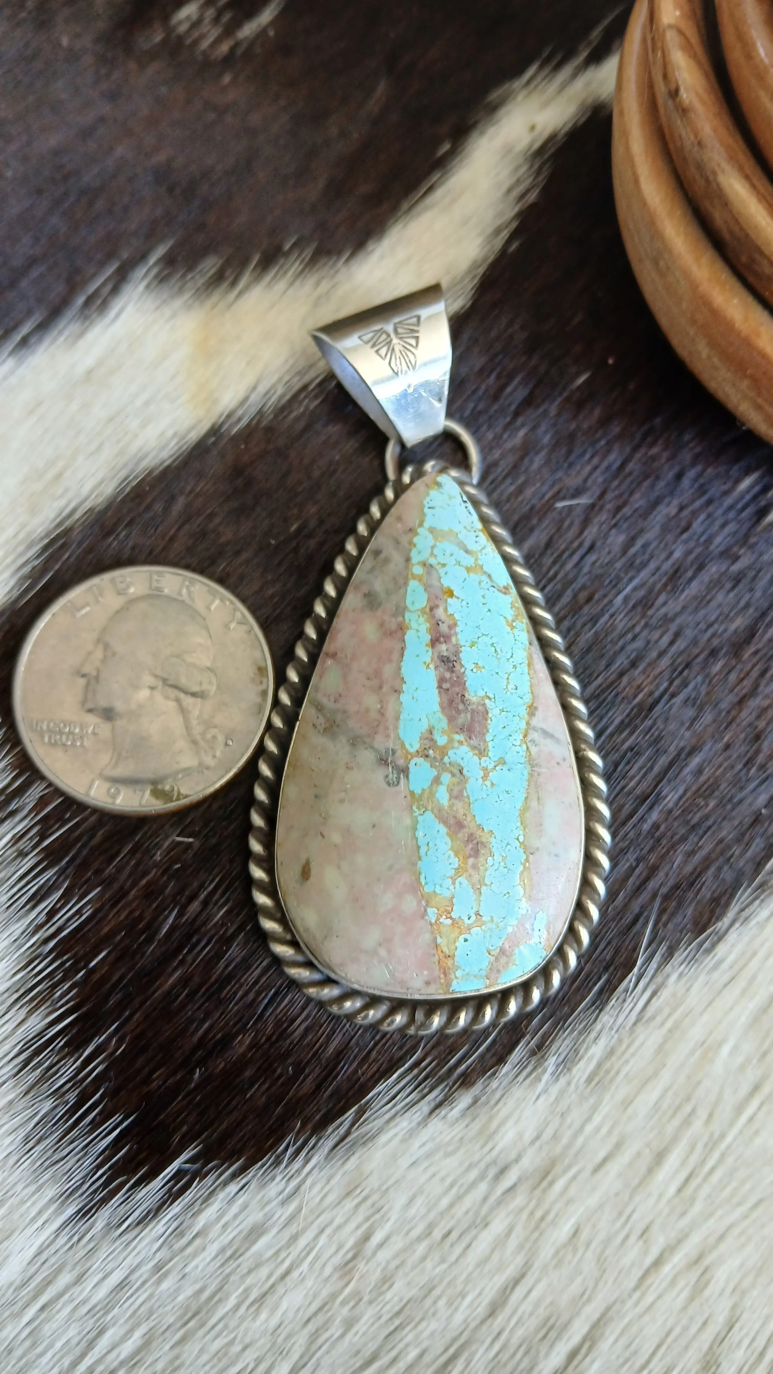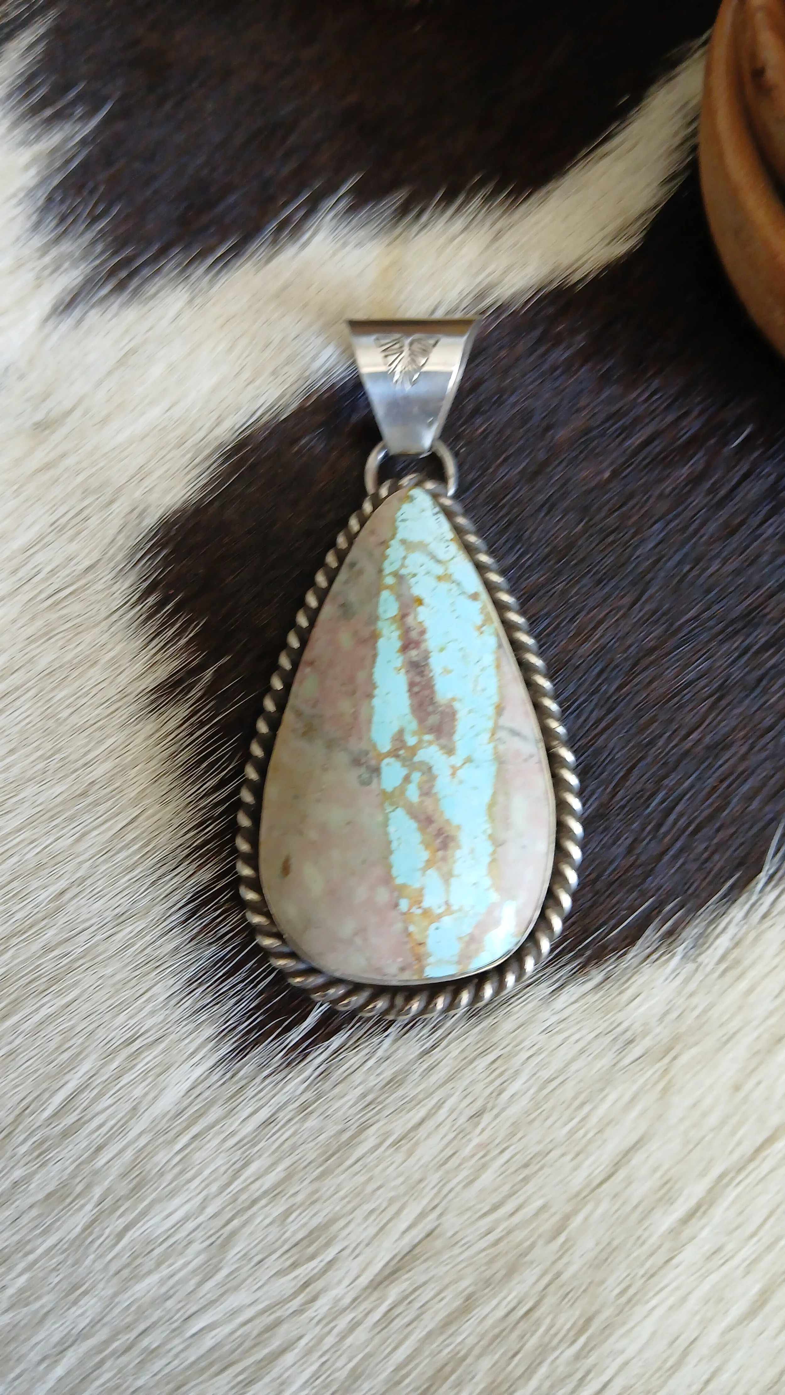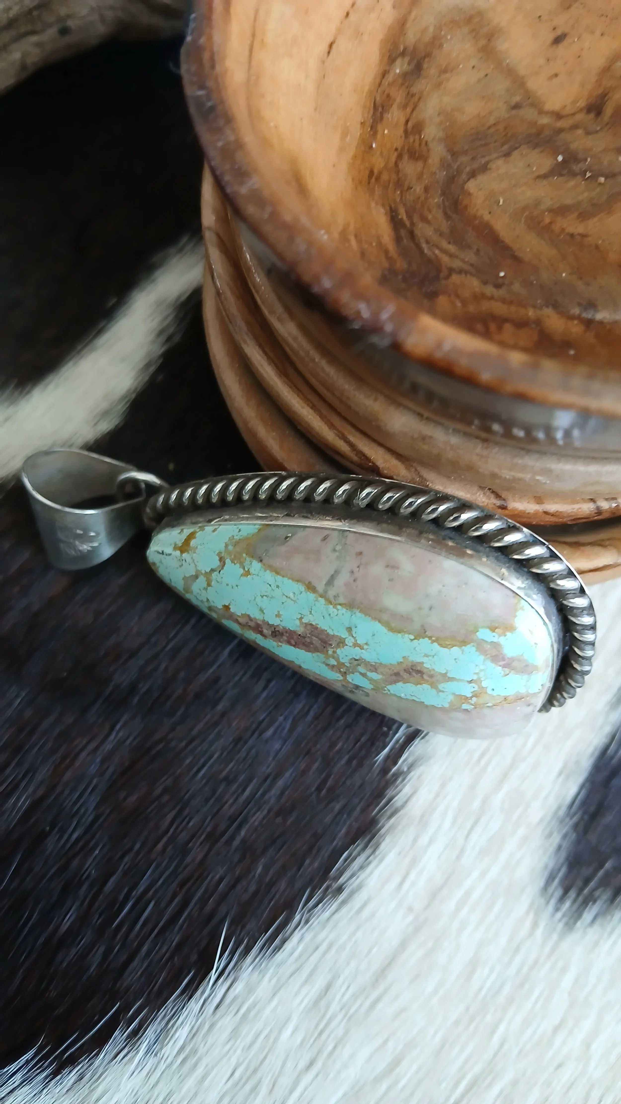 A fabulous Royston Ribbon turquoise cabochon (thick and heavy) is set in a straight bezel, decorated with rope wire and hangs from a hand stamped bail. Handcrafted by Rodney of Rafter G Collections.